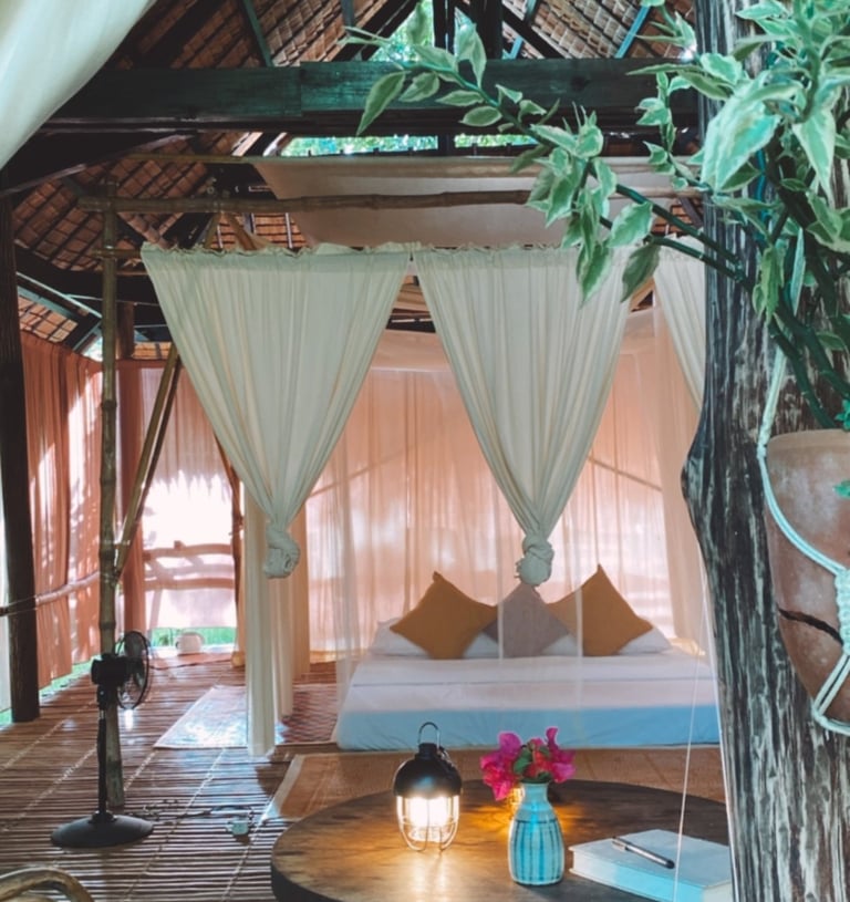 We offer an immersive nature experience in our private kubos (huts). Hidden away in the privacy of the trees, the kubos feature curtains instead of walls, allowing the sunlight and breeze to peek through.